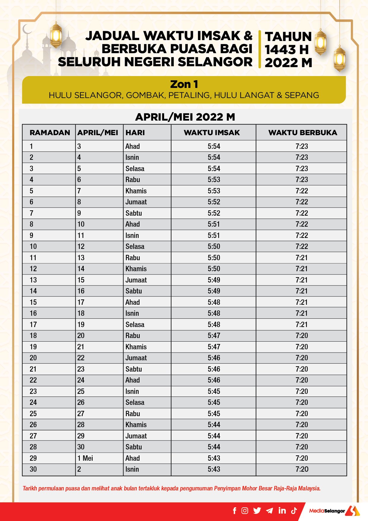 Berikut dikongsikan jadual waktu imsak. Jadual waktu berbuka puasa dan imsak yang dilampirkan ini adalah untuk bulan Ramadhan tahun 2022 1443 Hijrah bagi seluruh negeri Selangor Darul Ihsan. Gombak Petaling Sepang Hulu Langat Hulu Selangor Shah Alam Hari Ini Tukar Ahad 6.